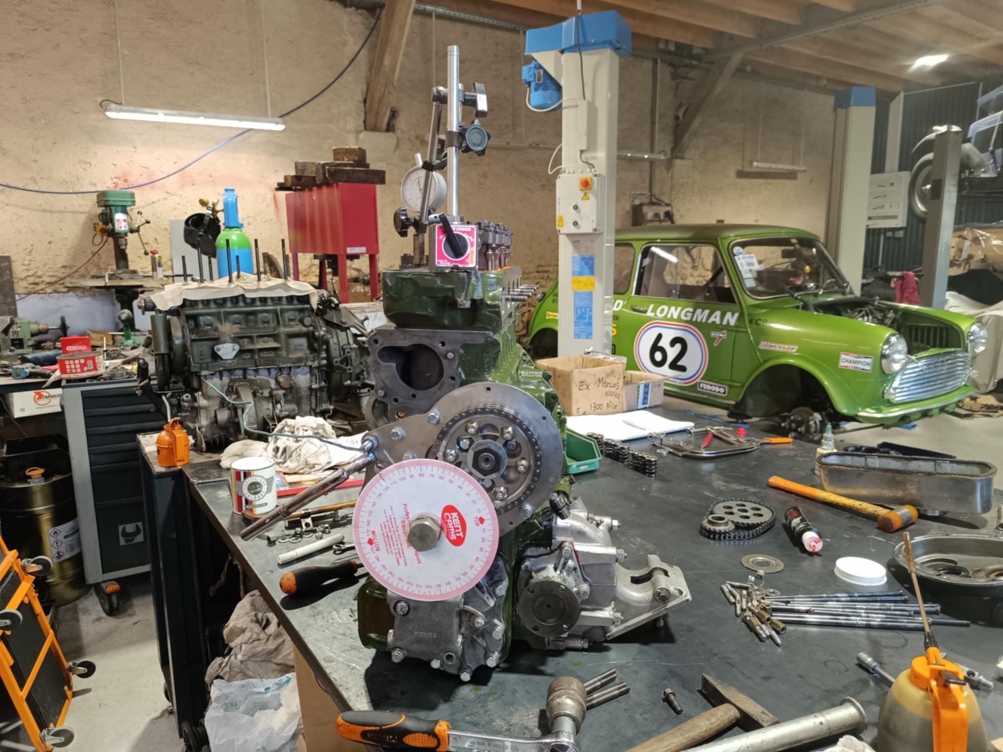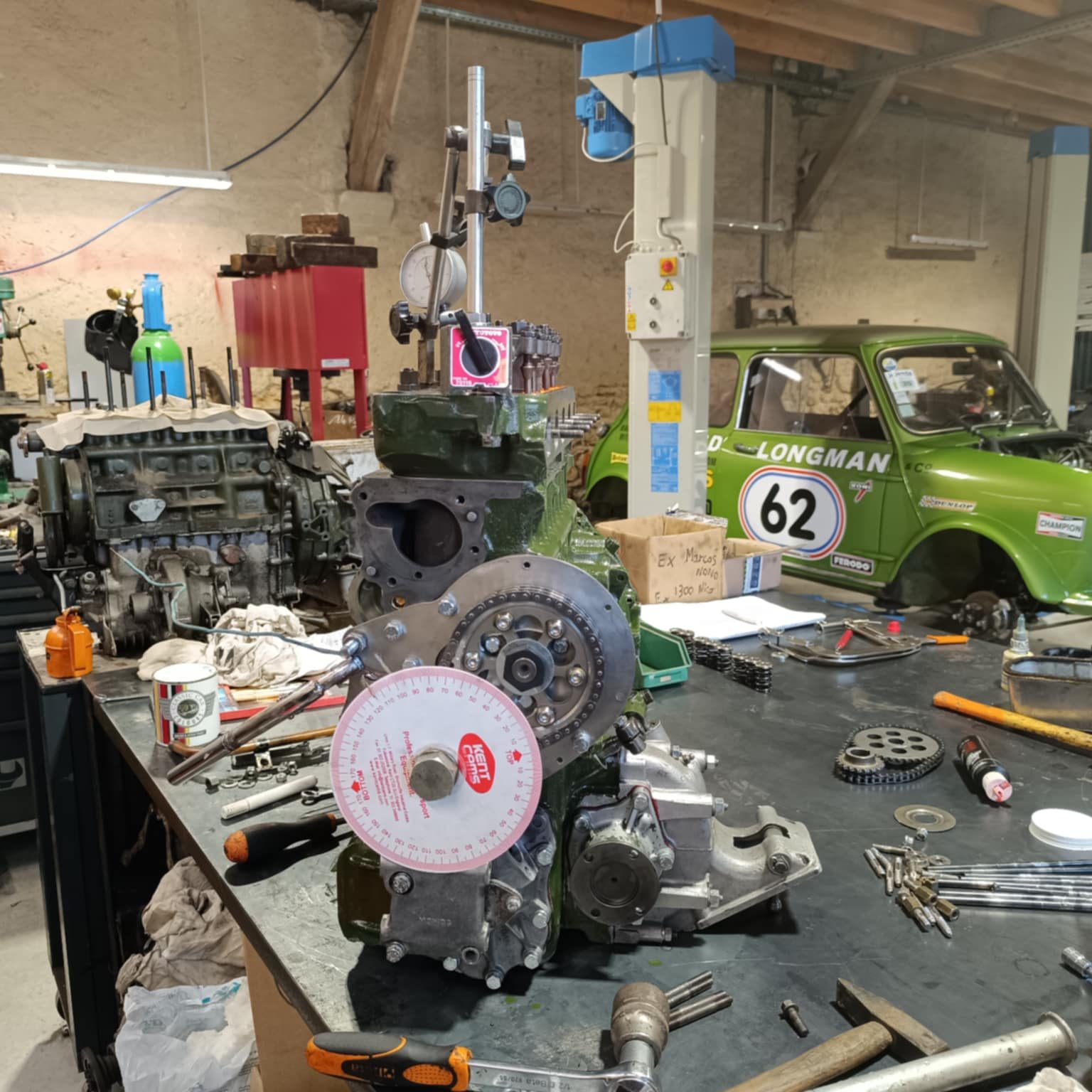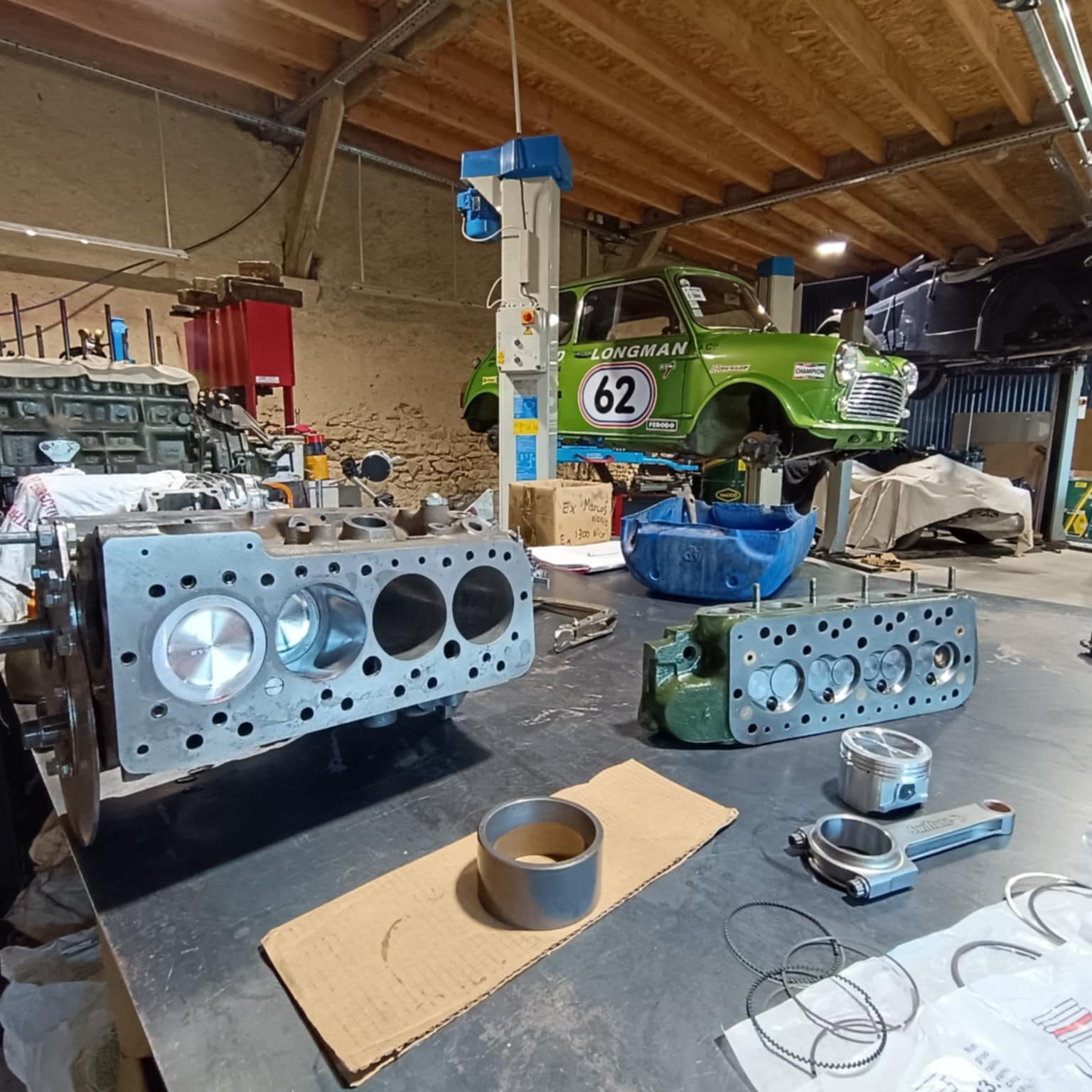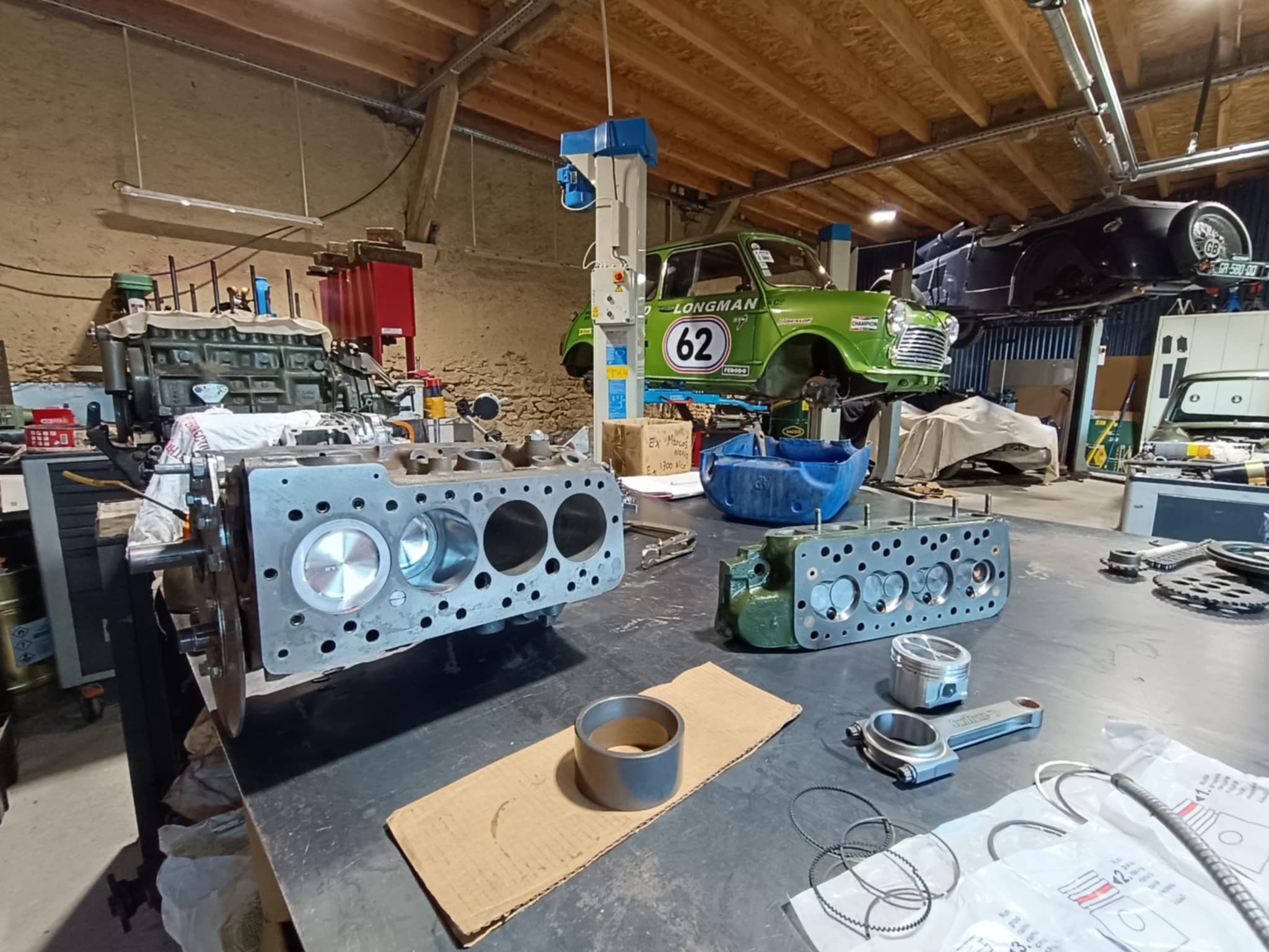 culasse grosses soupapes avec des conduits retravaillés, rampe de culbuteurs haute levée, l’arbre à cames est un vieux profile, c’est un Kent 286, en ce qui concerne l’équipage mobile le vilebrequin est d’origine, retaillé et traité, avec un volant moteur fastroad, le tout équilibré.