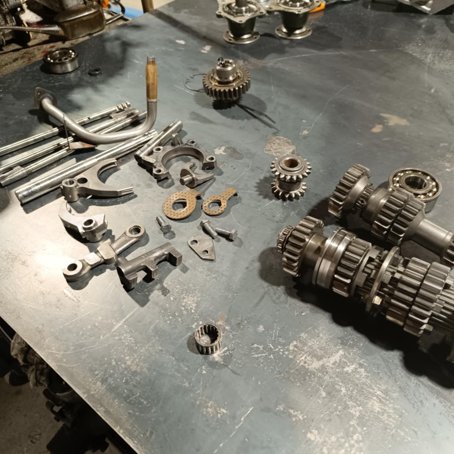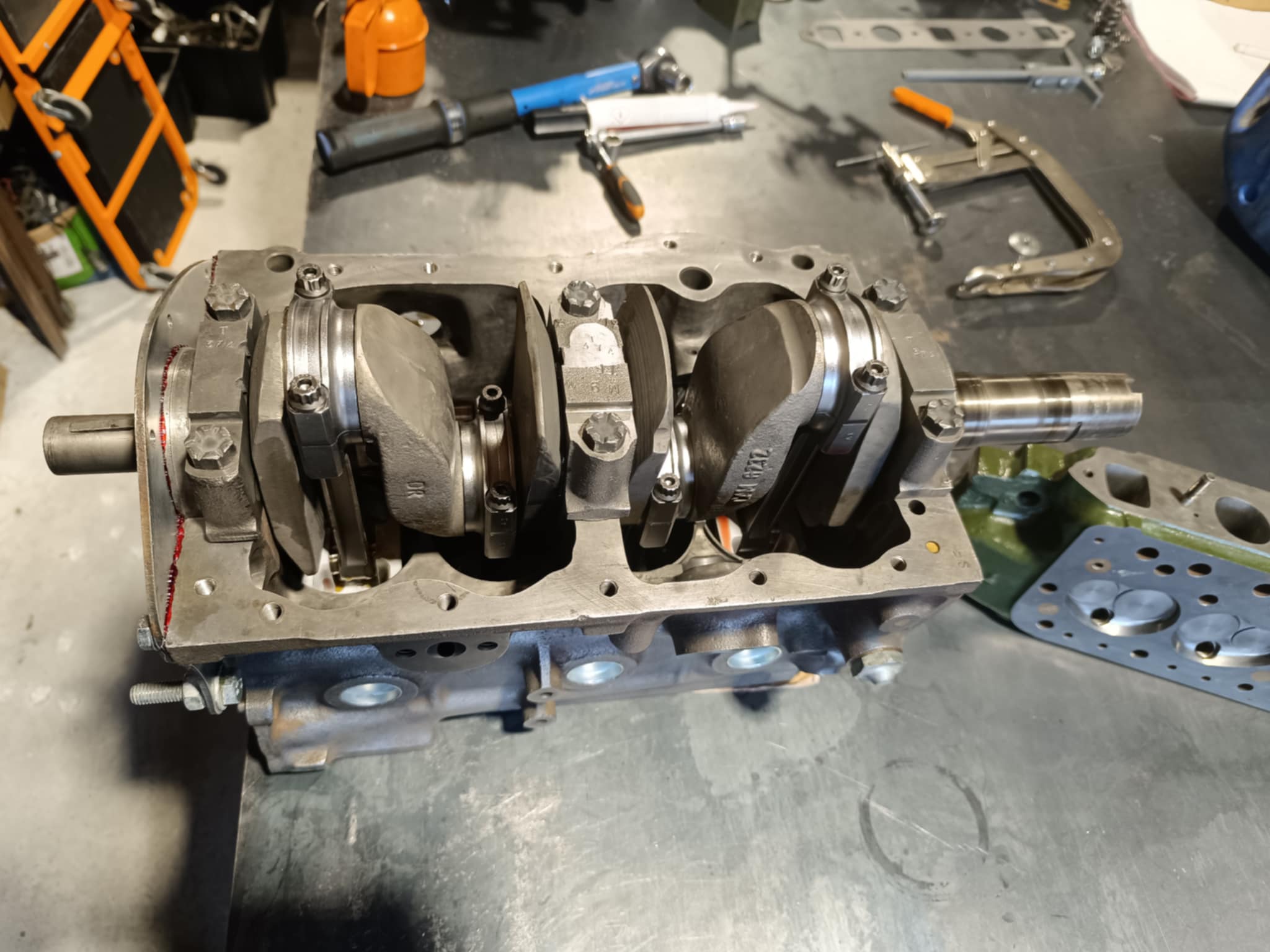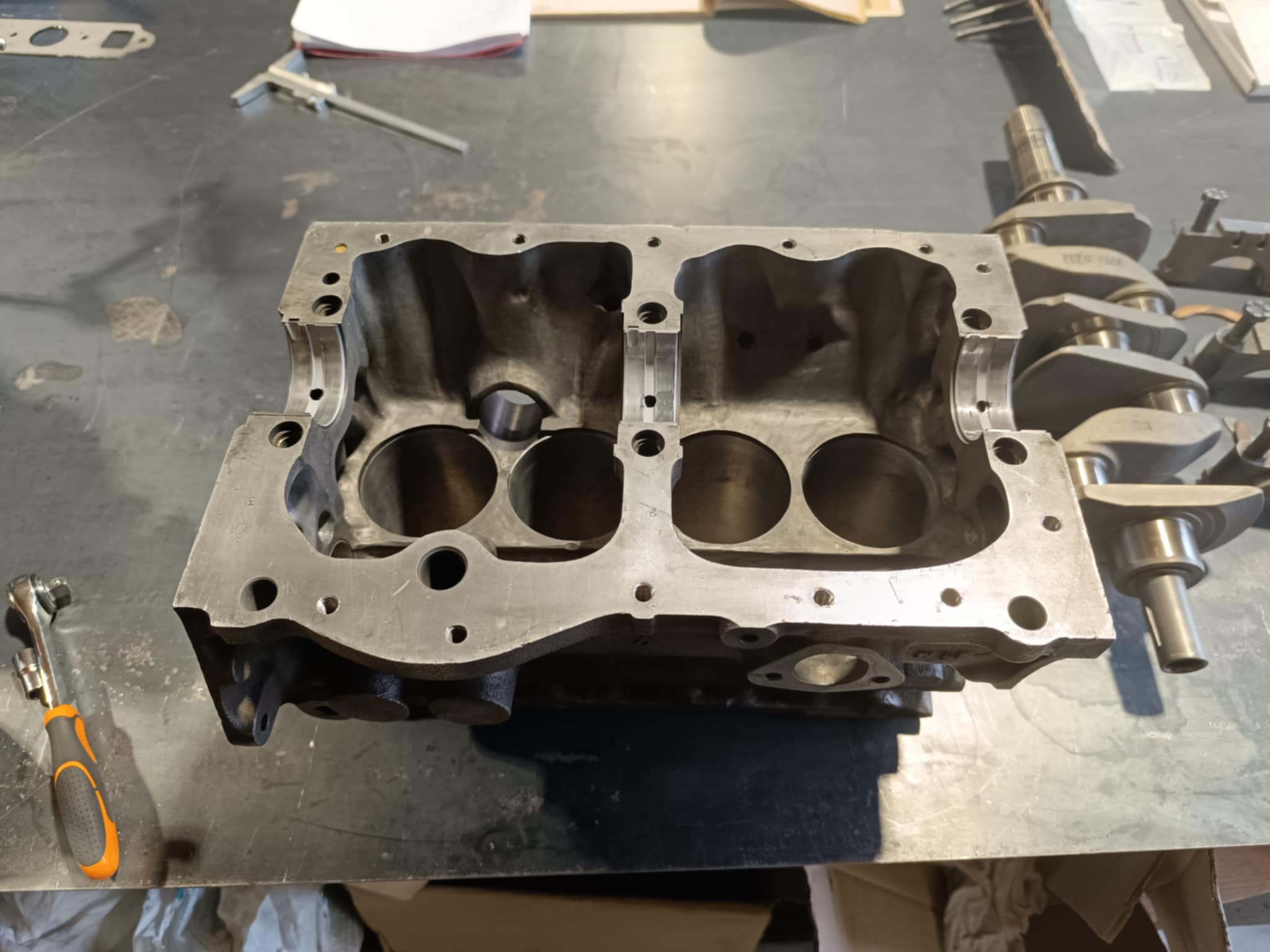 culasse grosses soupapes avec des conduits retravaillés, rampe de culbuteurs haute levée, l’arbre à cames est un vieux profile, c’est un Kent 286, en ce qui concerne l’équipage mobile le vilebrequin est d’origine, retaillé et traité, avec un volant moteur fastroad, le tout équilibré.