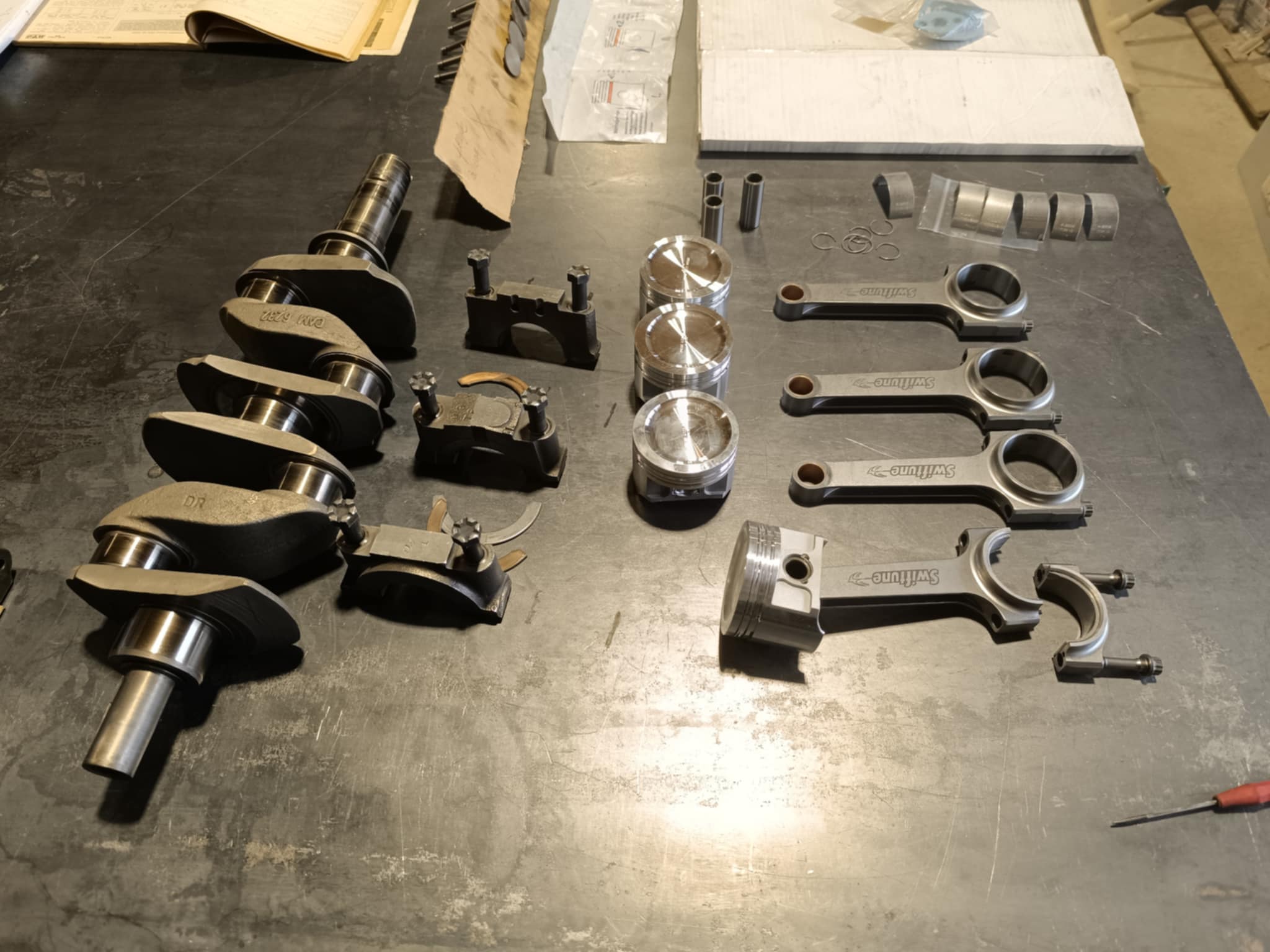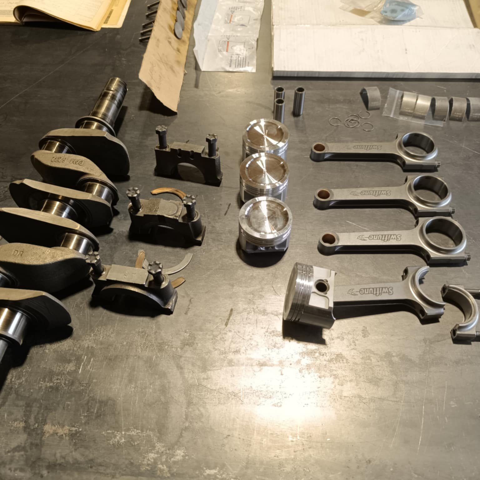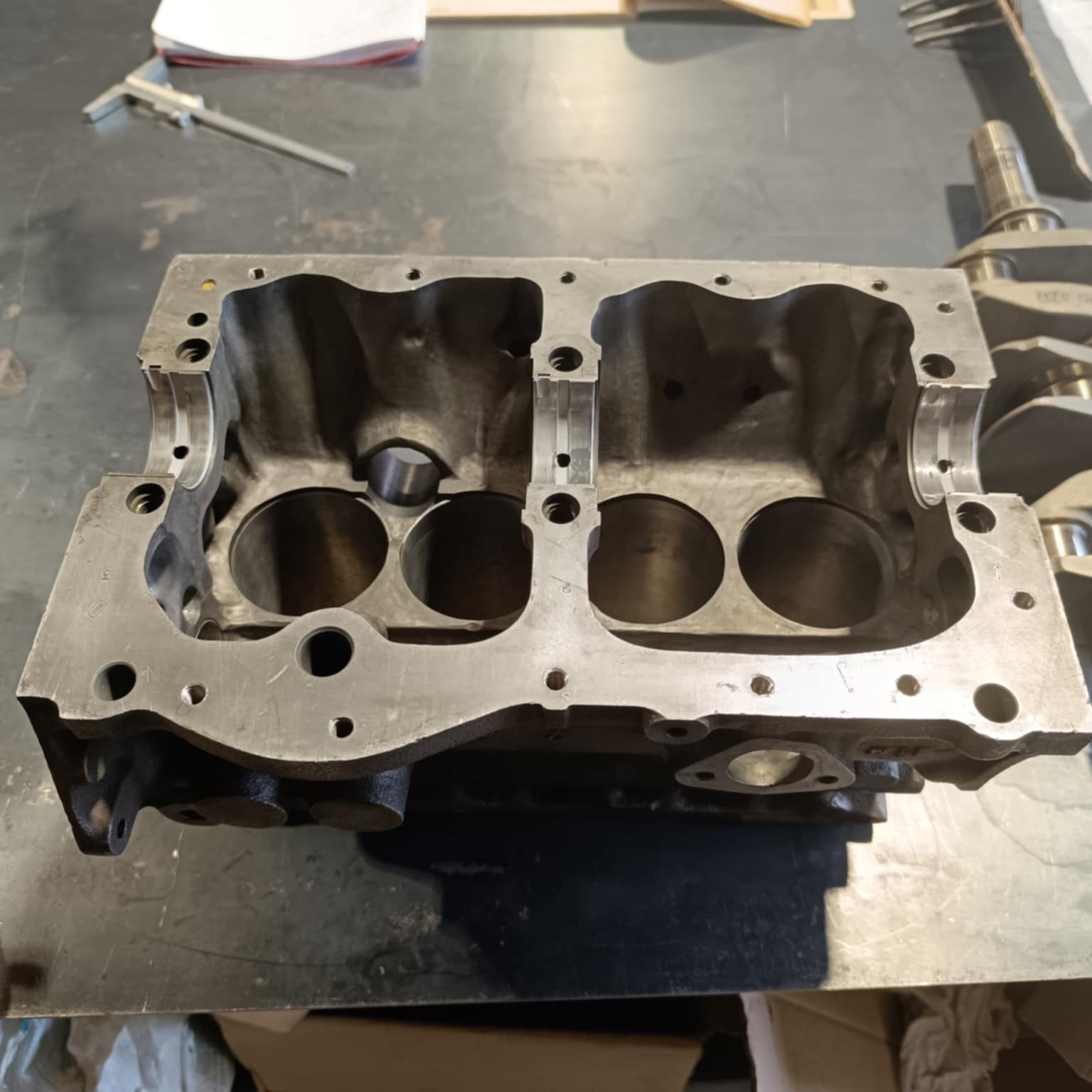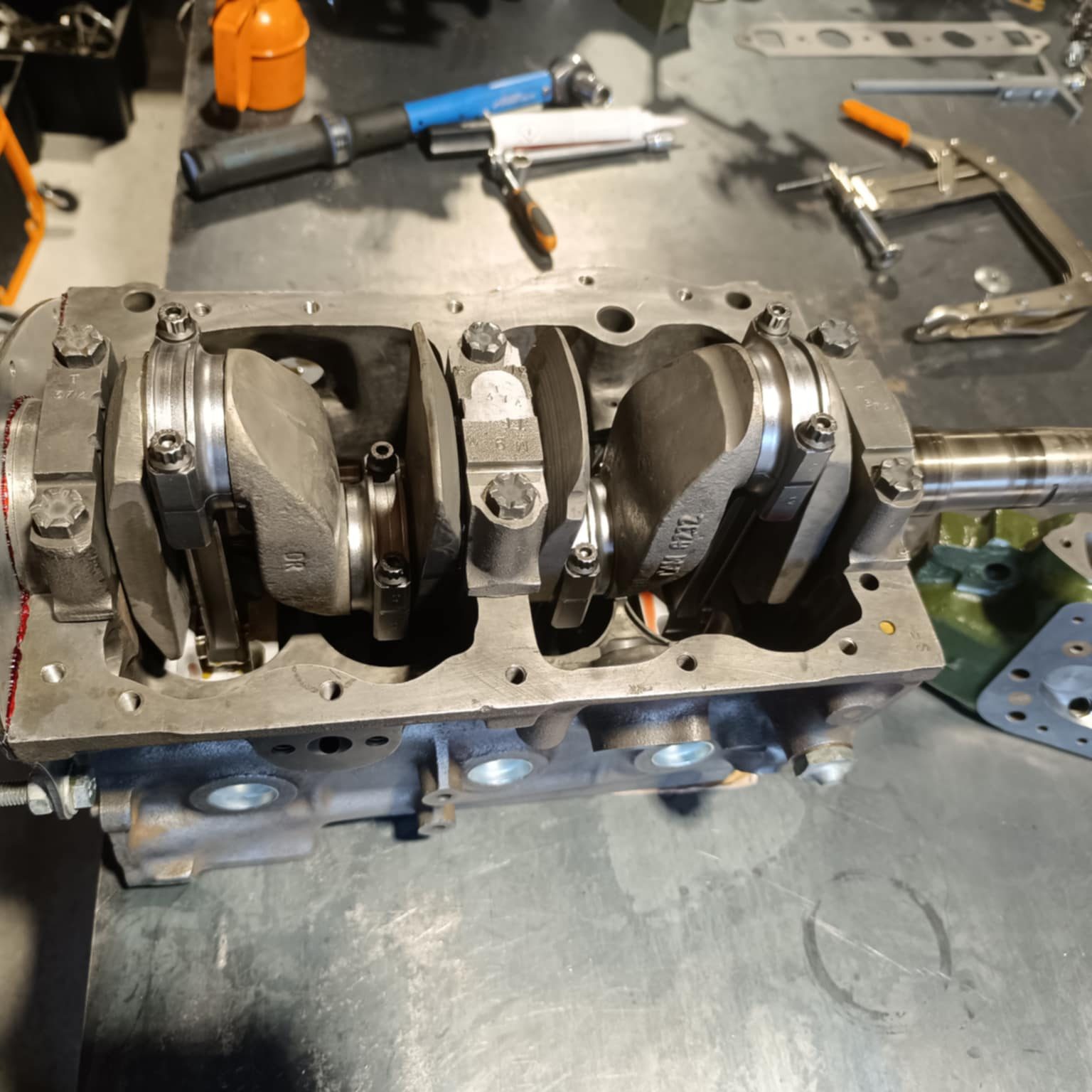 culasse grosses soupapes avec des conduits retravaillés, rampe de culbuteurs haute levée, l’arbre à cames est un vieux profile, c’est un Kent 286, en ce qui concerne l’équipage mobile le vilebrequin est d’origine, retaillé et traité, avec un volant moteur fastroad, le tout équilibré.