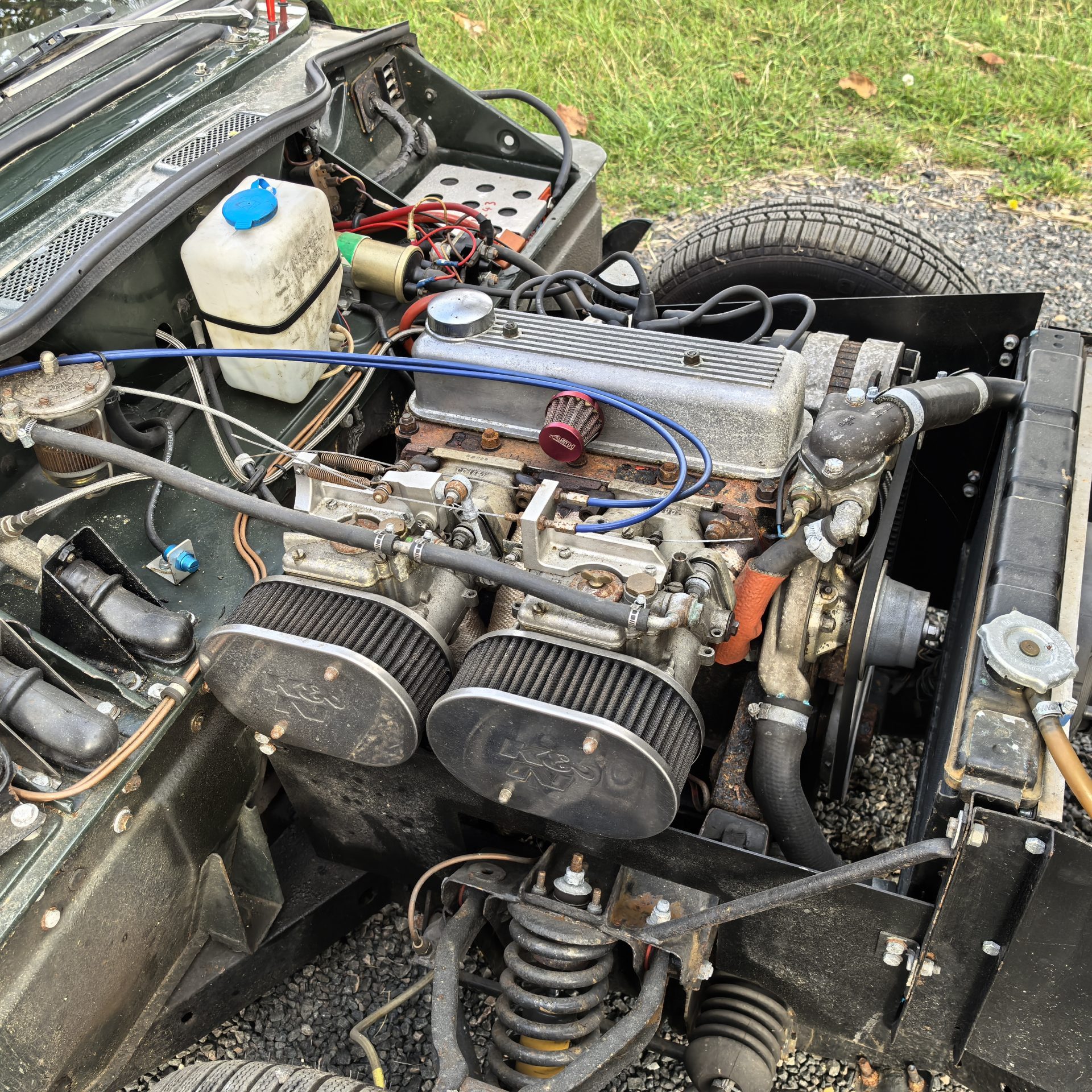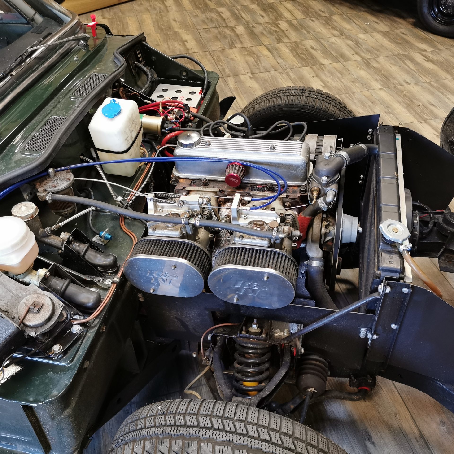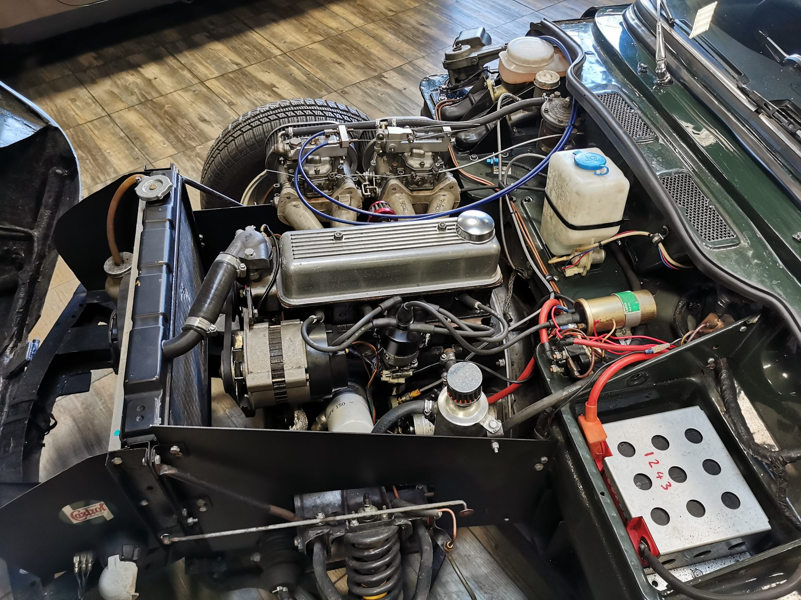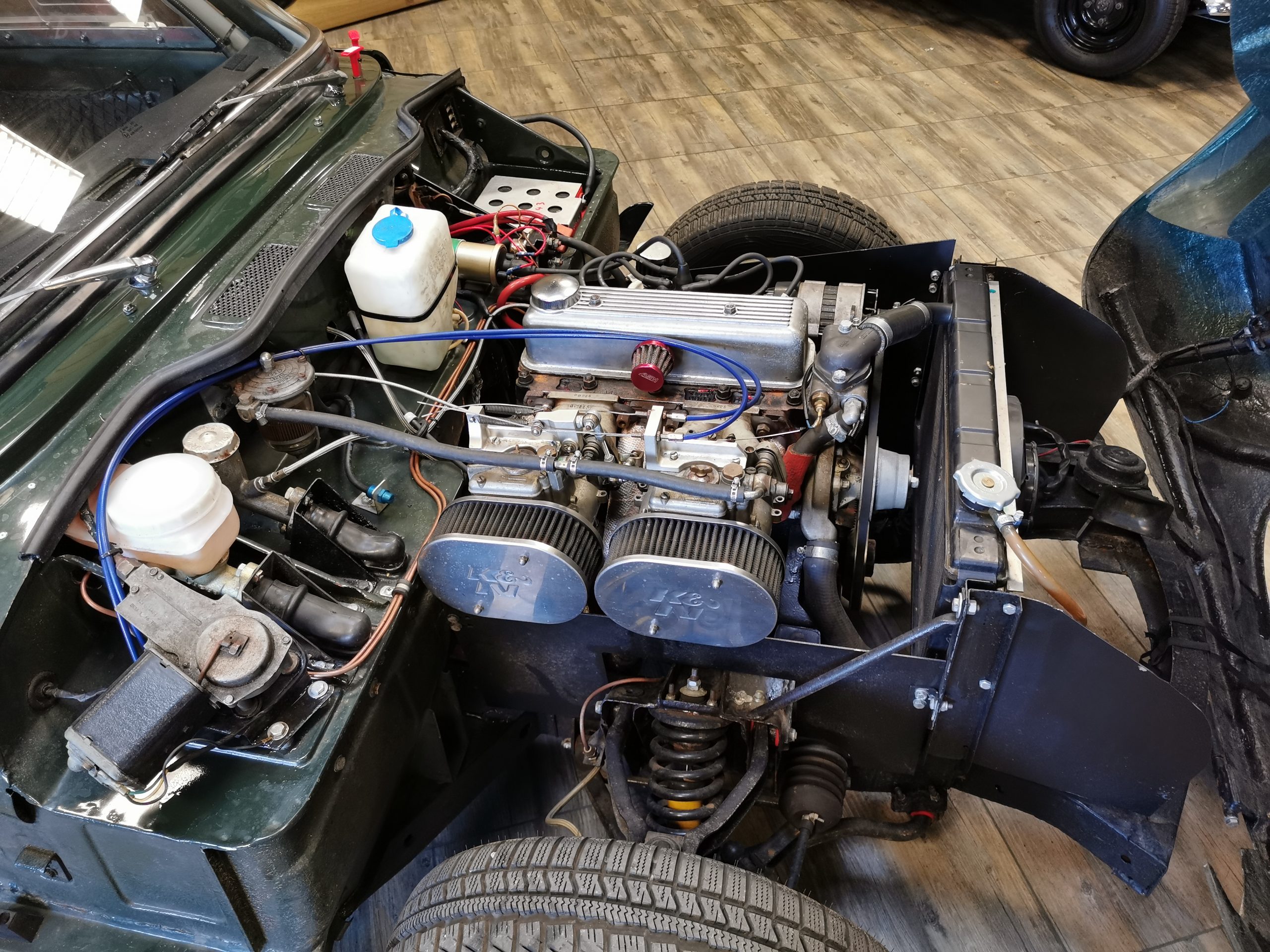 Moteur préparé, 4 cylindres 1320 cm3 alimenté par 2 carburateurs Weber de 40 (fiche de puissance à 103 CV révisé en 2018)