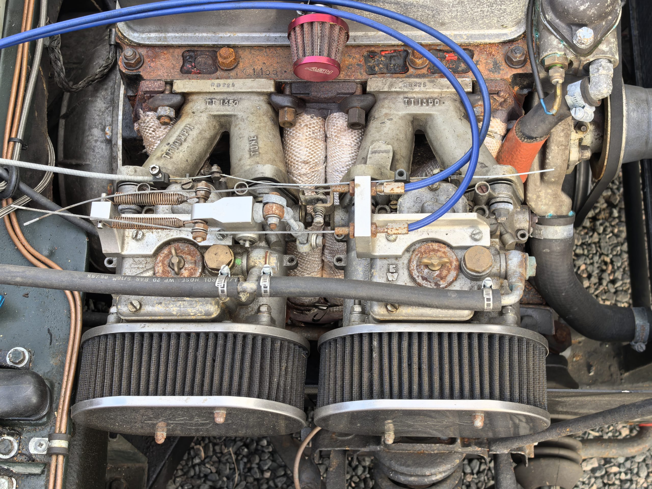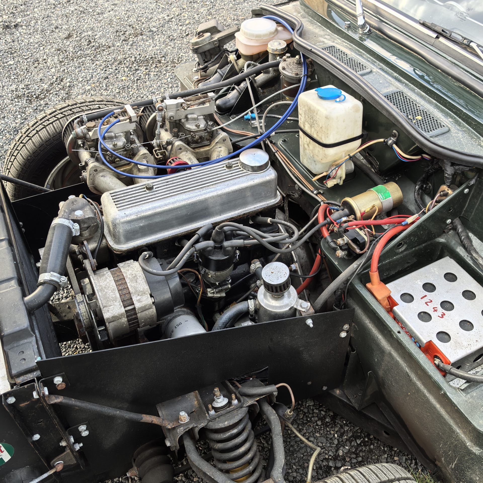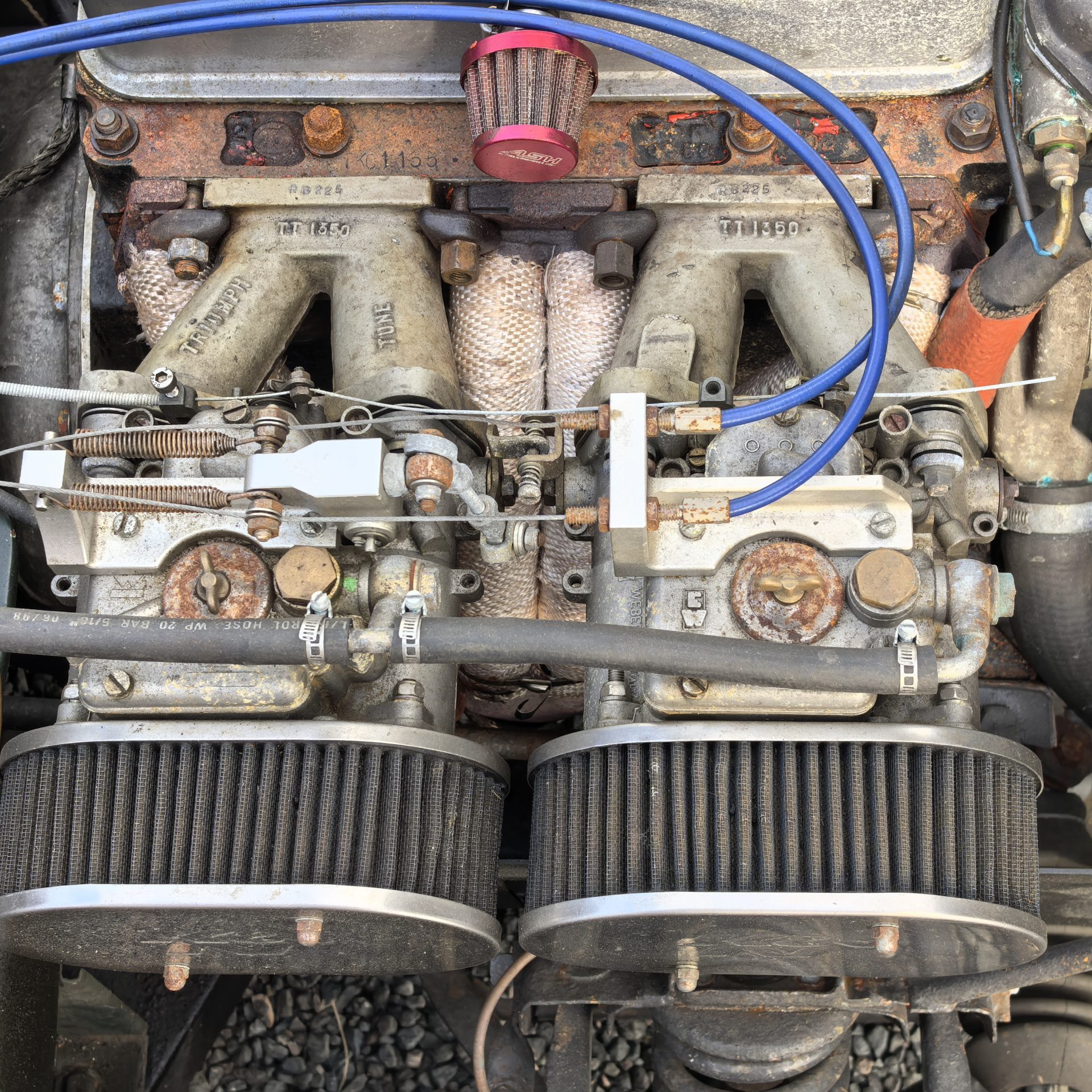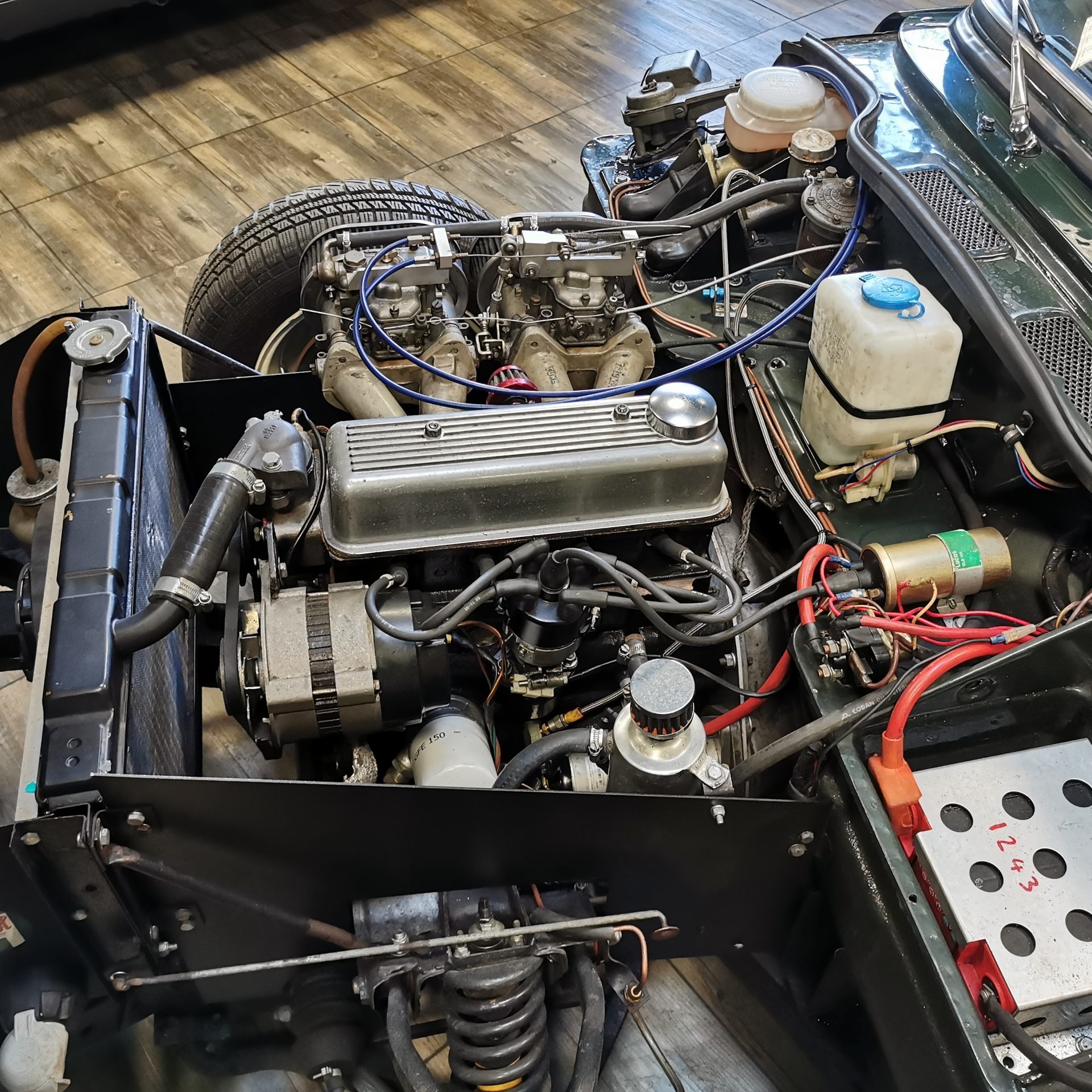 Moteur préparé, 4 cylindres 1320 cm3 alimenté par 2 carburateurs Weber de 40 (fiche de puissance à 103 CV révisé en 2018)